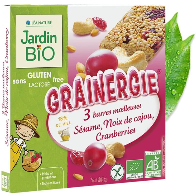 Jardin Bio Grainergie, 3 soft bars of sesame seeds, cashews, cranberry in addition to organic honey. Produced from organic farming to replenish energy.